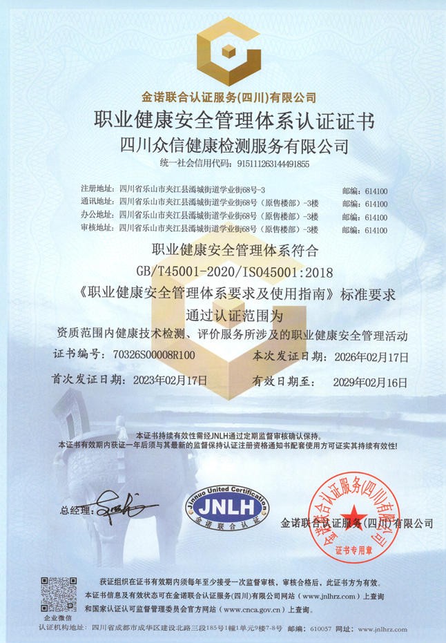 职业健康安全管理体系认证证书