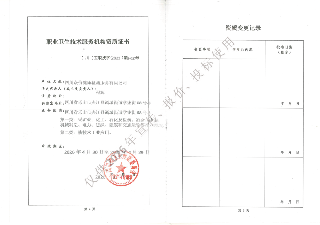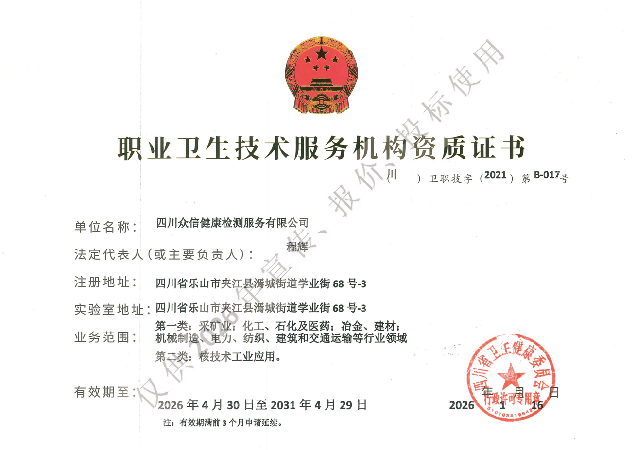 职业卫生技术服务机构资质证书